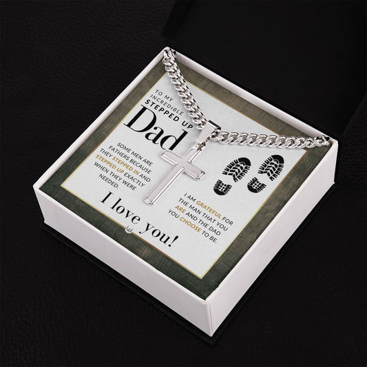 Stepped Up Dad Necklace - Men's Chain with Engravable Cross Necklace - Christian Jewelry For Dad For Father's Day, Christmas or His Birthday