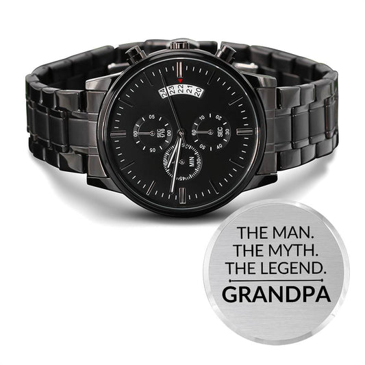 Gift For Grandpa - The Man. The Myth. The Legend. - Engraved Black Chronograph Men's Watch + Watch Box - Perfect Birthday Present or Christmas Gift For Him