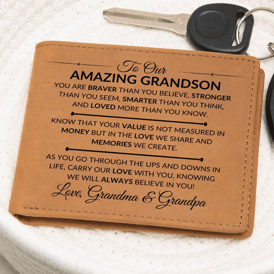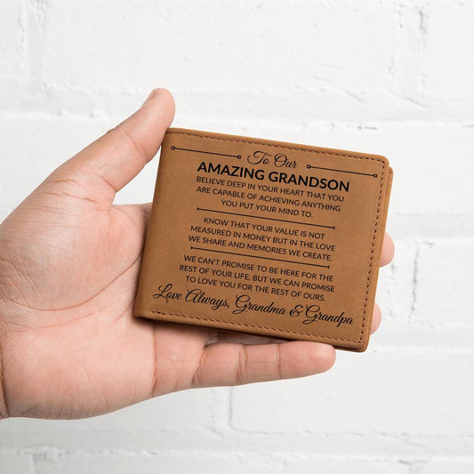 Gift For Our Grandson From Grandma and Grandpa - Carry Our Love With You - Men's Custom Bi-fold Leather Wallet - Great Christmas Gift or Birthday Present Idea