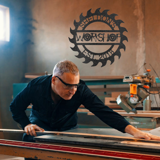 Metal Workshop Sign with Sawblade - Personalized Workshop Sign, Custom Garage Sign, Workshop, Man Cave Decor, Large Metal Sign
