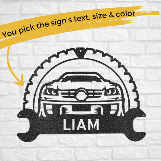 Metal Sign with Engine and Wrench - Personalized Workshop Sign, Custom Garage Sign, Workshop, Man Cave Decor, Large Metal Sign