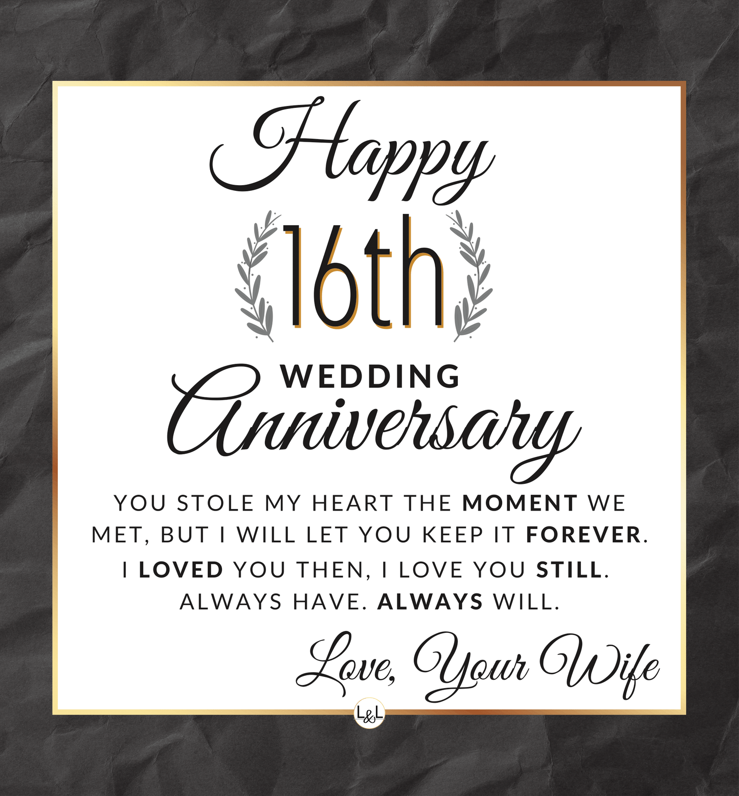 The printed message card inside the watch gift box reads: Happy 16th wedding anniversary! You stole my heart the momentwe met, But I will let you keep it forever. I loved you then, I love you still. Always have. Always Will. Love, Your Wife