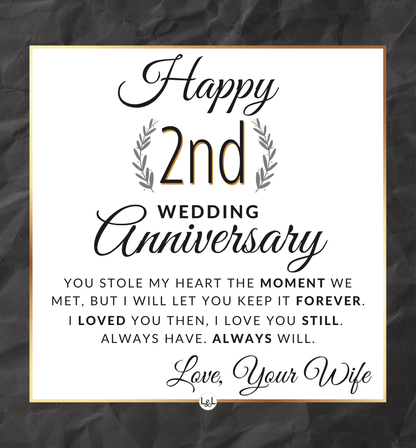 The printed message card inside the watch gift box reads: Happy 2nd wedding anniversary! You stole my heart the momentwe met, But I will let you keep it forever. I loved you then, I love you still. Always have. Always Will. Love, Your Wife