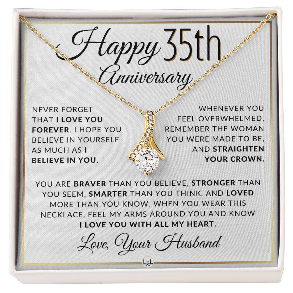 Are you looking for a thoughtful and unique 35th anniversary gift idea for your wife? Are you looking for a present that will be treasured for years to come? Celebrate your wife and your marriage of 35 years with this beautiful pendant necklace and a heartfelt message.