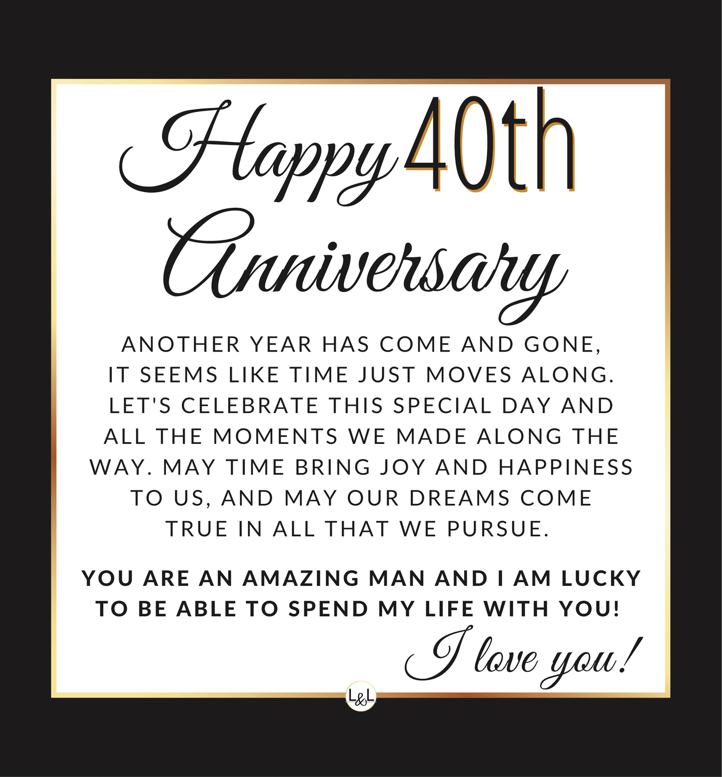The printed message card inside the watch gift box reads: "Happy 40th Anniversary! A whole year has come and gone, it seems like time just moves along. Let's celebrate this special day and all the moments we made along the way. May time bring joy and happiness to us, and may our dreams come true in all that we pursue. You are an amazing man and I am lucky to be able to spend my life with you! I love you!"