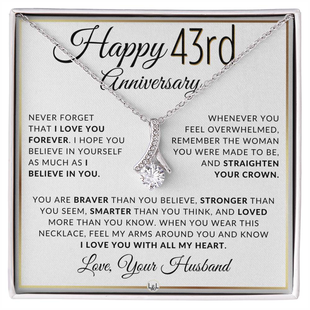 Are you looking for a thoughtful and unique 43rd anniversary gift idea for your wife? Are you looking for a present that will be treasured for years to come? Celebrate your wife and your marriage of 43 years with this beautiful pendant necklace and a heartfelt message.