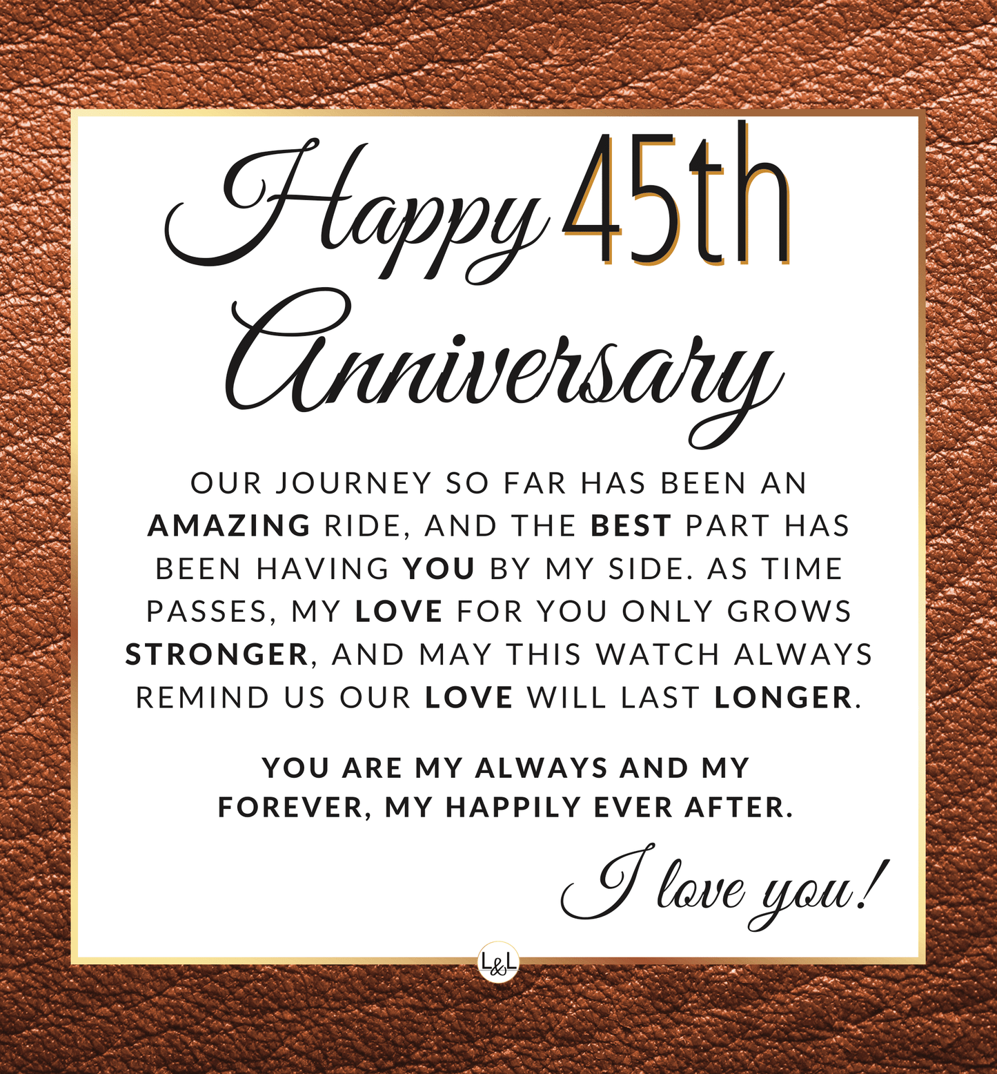 The printed message card inside the watch gift box reads: Happy 45th Anniversary. Our journey so far has been an amazing ride, And the best part has been having you by my side. As time passes, my love for you only grows stronger, And may this watch always remind us our love will last longer. You are my always and My forever, my happily ever after. I love you!
