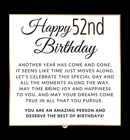 The printed message inside the watch gift box reads: Happy 52nd Birthday!Another year has come and gone, it seems like time just moves along. Let's celebrate this special day and all the moments along the way. May time bring joy and happiness to you, and may your dreams come true in all that you pursue.