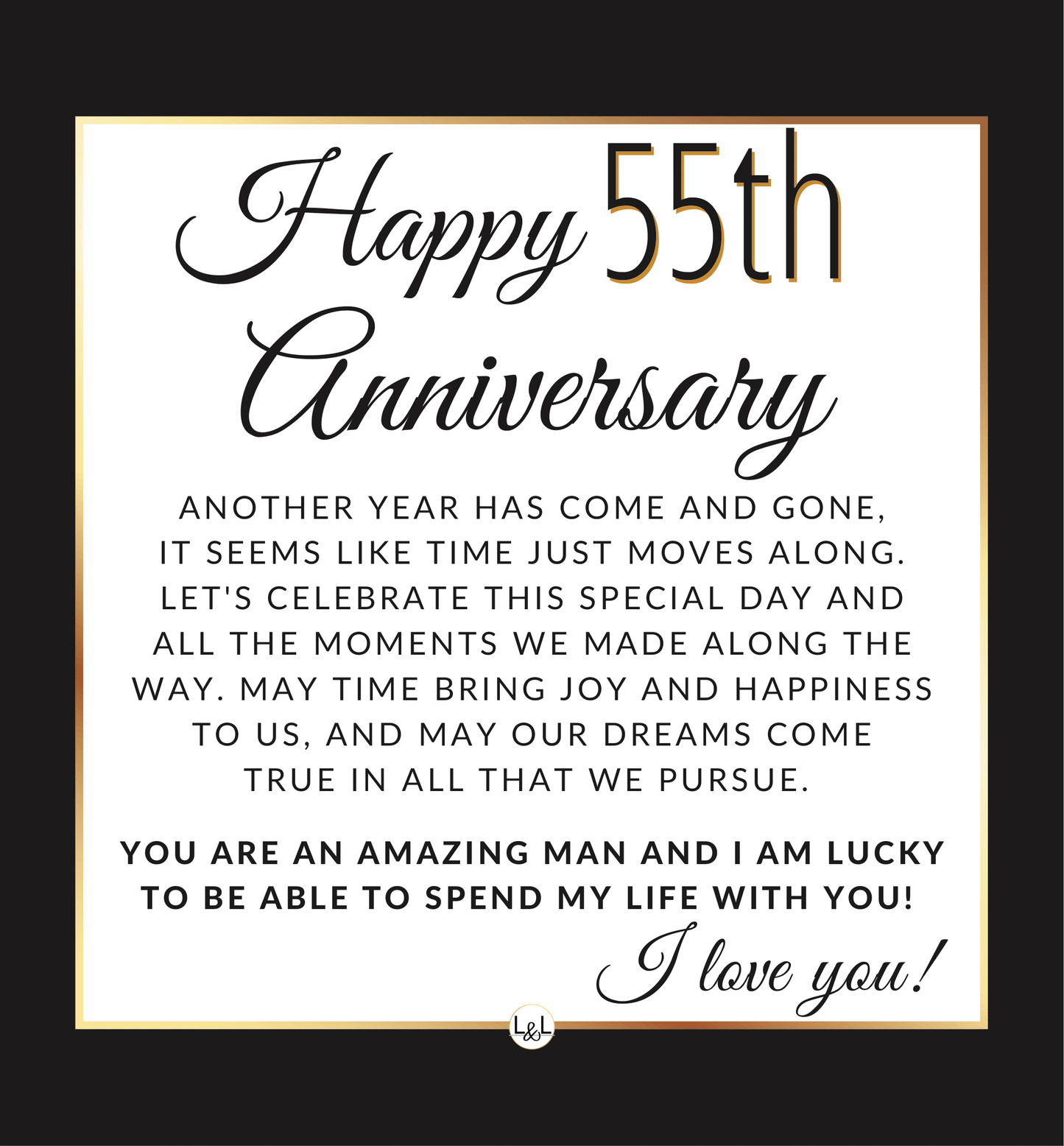 The printed message card inside the watch gift box reads: "Happy 55th Anniversary! A whole year has come and gone, it seems like time just moves along. Let's celebrate this special day and all the moments we made along the way. May time bring joy and happiness to us, and may our dreams come true in all that we pursue. You are an amazing man and I am lucky to be able to spend my life with you! I love you!"