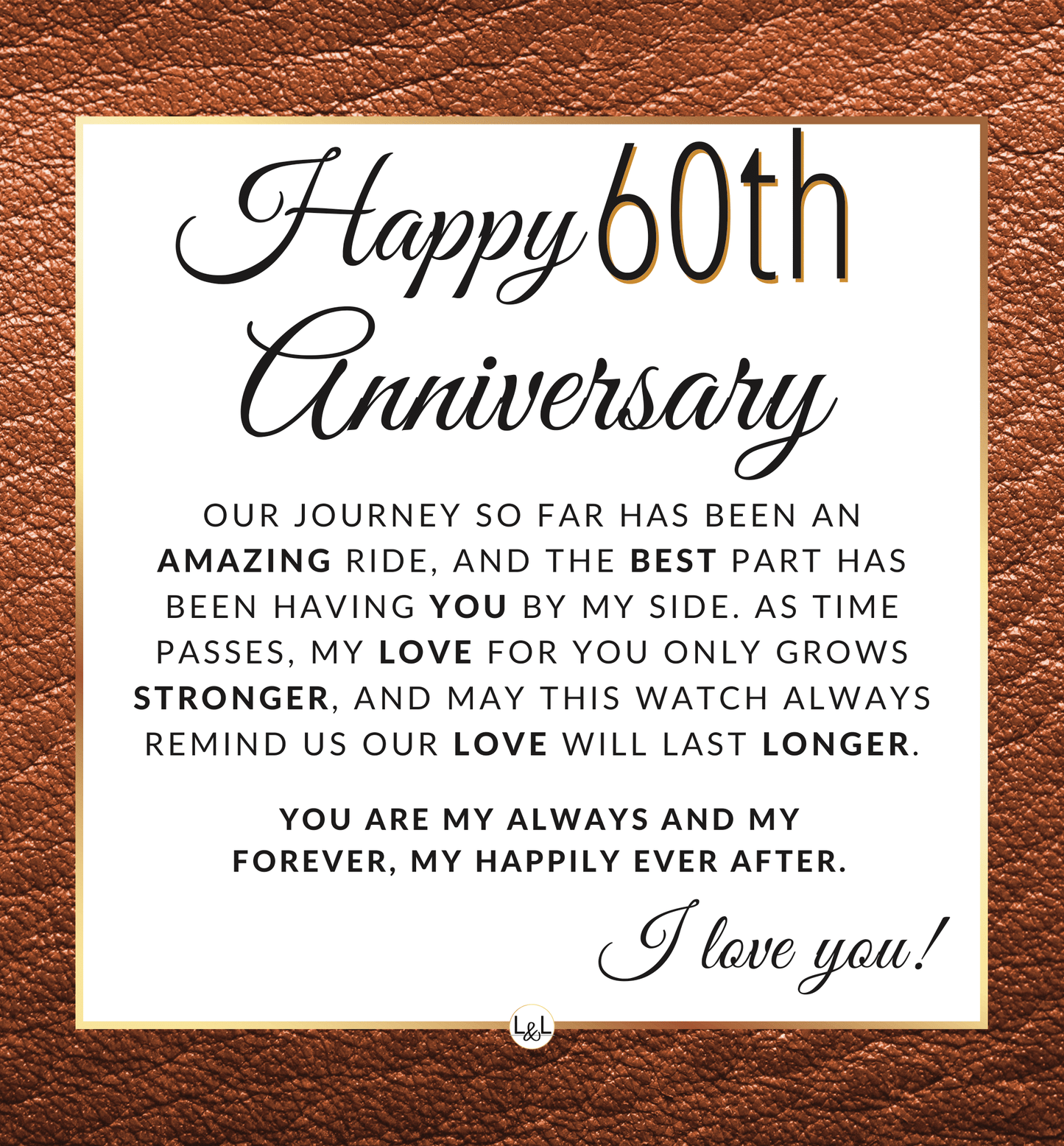 The printed message card inside the watch gift box reads: Happy 60th Anniversary. Our journey so far has been an amazing ride, And the best part has been having you by my side. As time passes, my love for you only grows stronger, And may this watch always remind us our love will last longer. You are my always and My forever, my happily ever after. I love you!