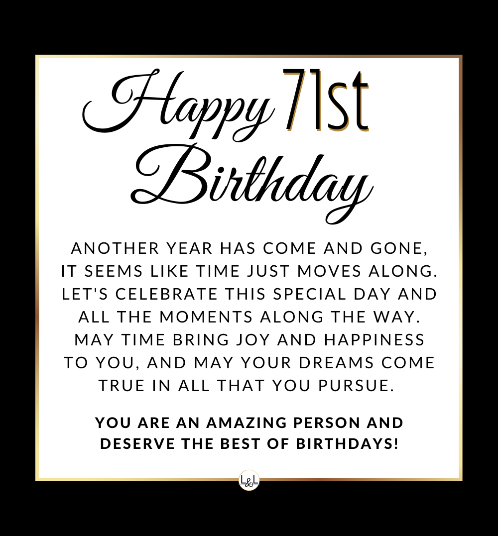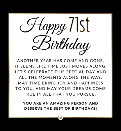 The printed message inside the watch gift box reads: Happy 71st Birthday! Another year has come and gone, it seems like time just moves along. Let's celebrate this special day and all the moments along the way. May time bring joy and happiness to you, and may your dreams come true in all that you pursue.
