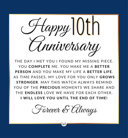 The printed message card inside the watch gift box reads: Happy 10th anniversary. The day I met you I found my missing piece. You complete me. You make me a better person and you make my life a better life. As time passes, my love for you only grows stronger. May this watch always remind you of the precious moments we share and the endless love we have for each other. I will love you until the end of time! Forever and always.