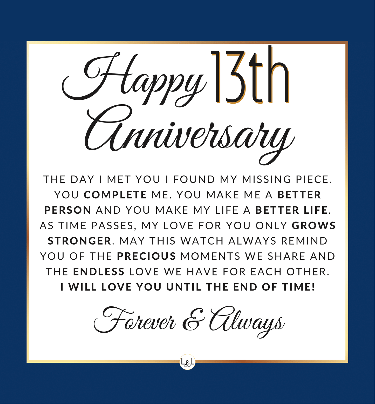 The printed message card inside the watch gift box reads: Happy 13th anniversary. The day I met you I found my missing piece. You complete me. You make me a better person and you make my life a better life. As time passes, my love for you only grows stronger. May this watch always remind you of the precious moments we share and the endless love we have for each other. I will love you until the end of time! Forever and always.