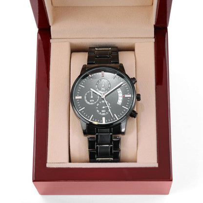- A custom gift that can withstand constant use, this Engraved Design Black Chronograph Watch is the perfect gift - it's a versatile piece sure to warm hearts and create smiles. Featuring a three-dial face, calendar function, and luxury pointer in a water-resistant and scratch-proof vessel. Made from high-quality Stainless Steel and featuring a Copper Dial. Ships in a gift box - so it can be sent directly to your lucky recipient.