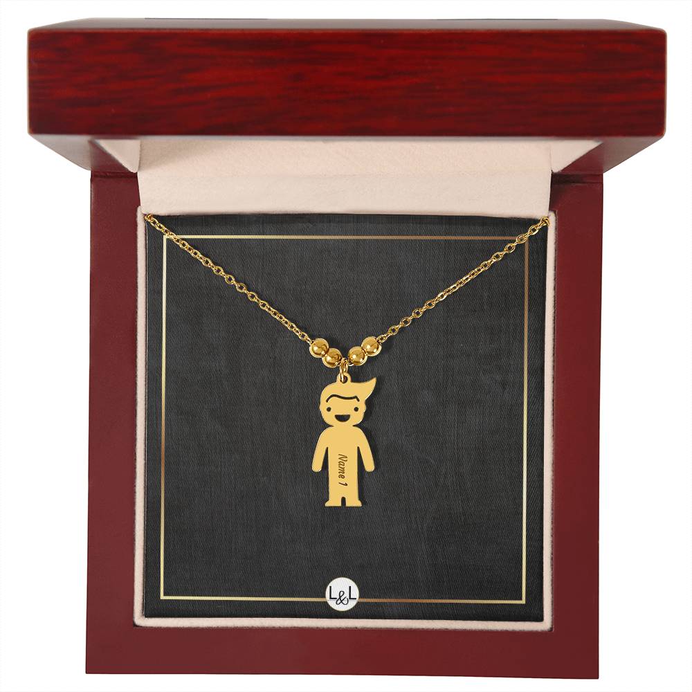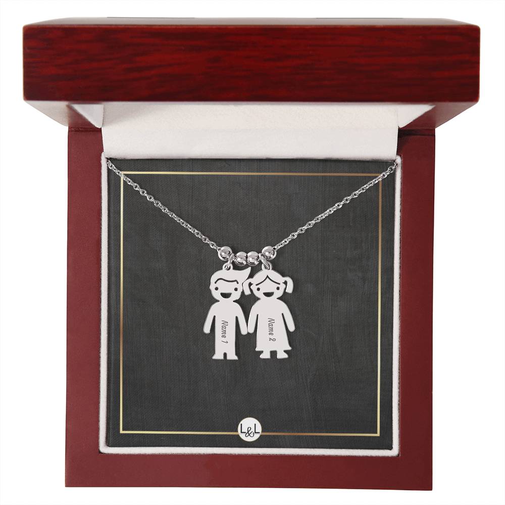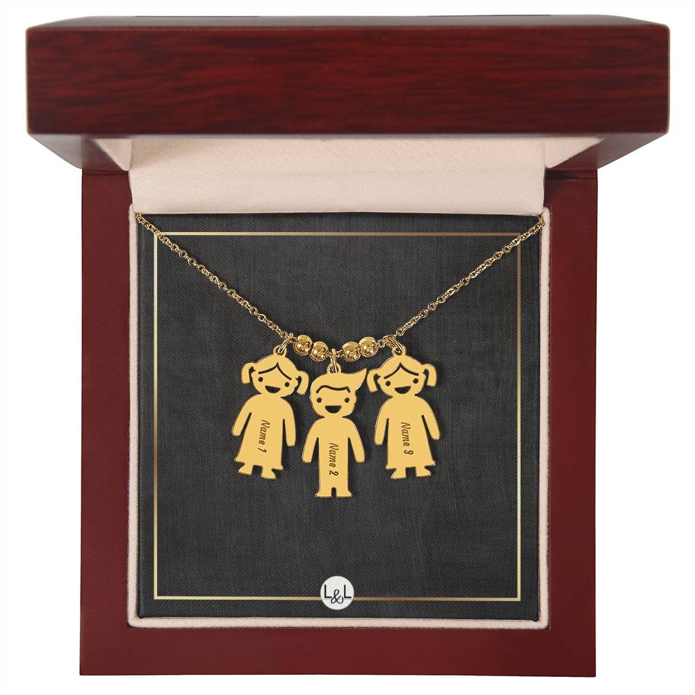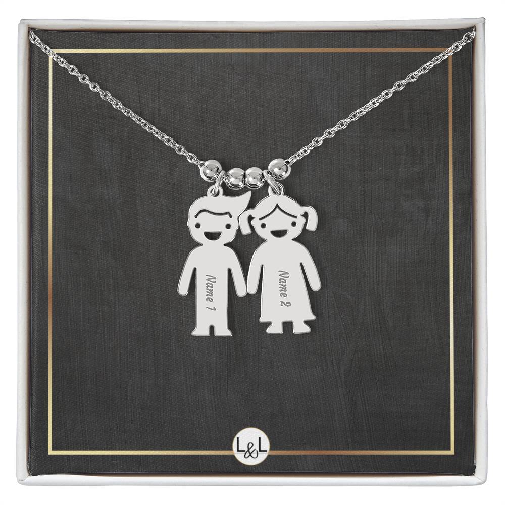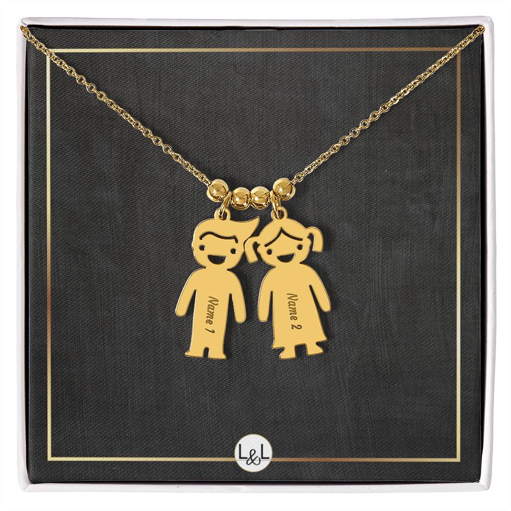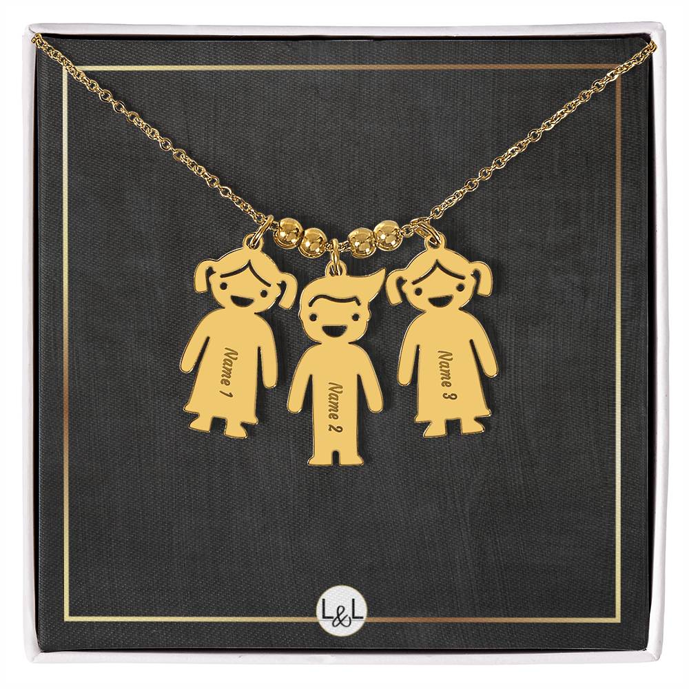 This unforgettable gift will leave her speechless! Introducing the Engraved Kids Charm Necklace. This necklace features up to three engraved charms, each shaped like a child, and can be personalized with the name or word of your choice. Made with high-quality materials, this necklace is a perfect gift for mothers and grandmothers who want to keep their children or grandchildren close to their heart. Whether you want to commemorate a special moment, celebrate a milestone, or simply express your love, this necklace is a perfect way to do it.