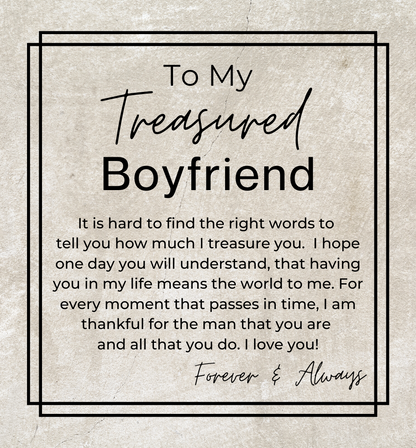 To My Treasured Boyfriend, It is hard to find the right words totell you how much I treasure you.I hope one day you will understand, that having you in my life means the world to me. For every moment that passes in time, I am thankful for the man that you areand all that you do. I love you!