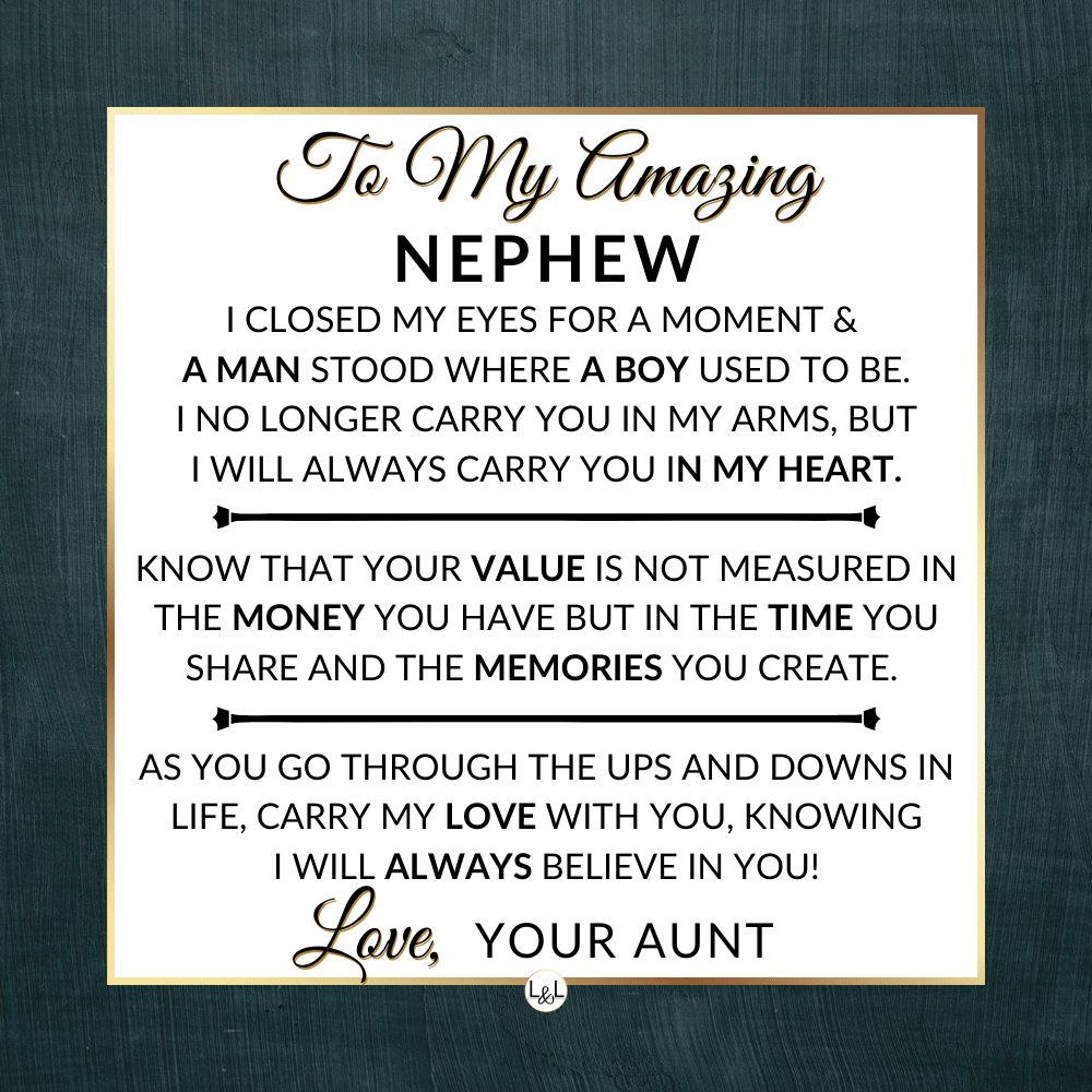 Are you looking for a unique gift idea for your nephew? One that is special from his aunt? Celebrate your nephew with this stunningMen's Braided Leather Bracelet with a Cross with a heartfelt keepsake message. It makes for a wonderful Christmas, birthday, or graduation gift.