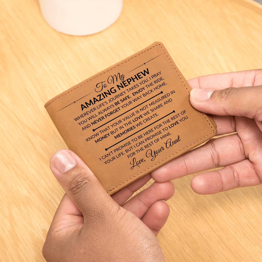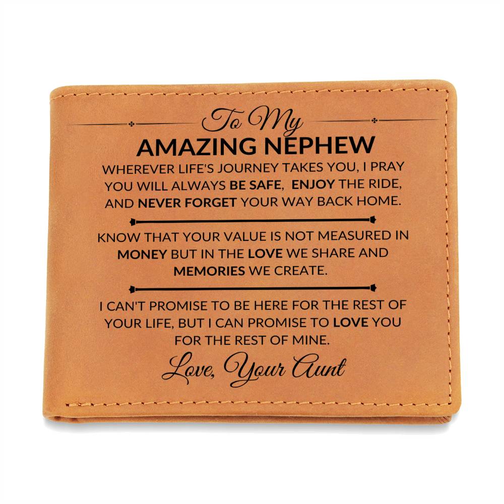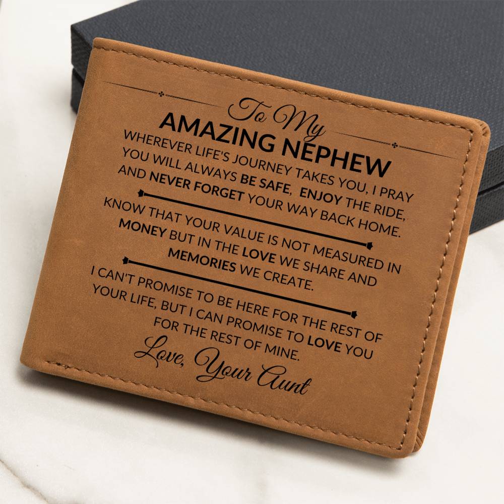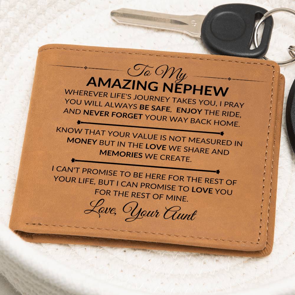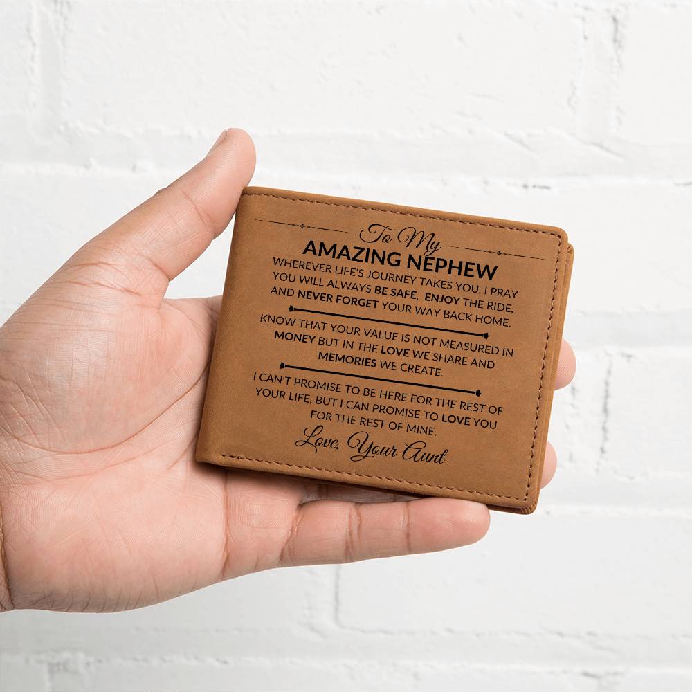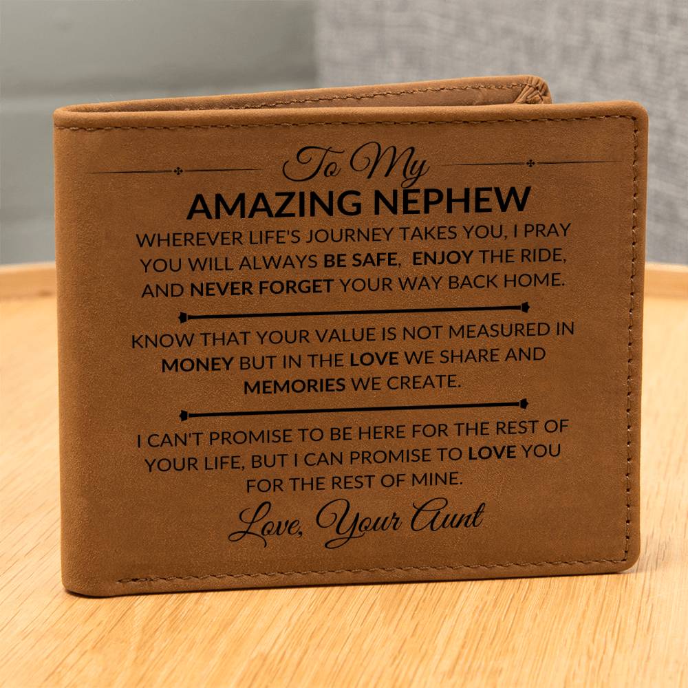 Gift For Nephew From Aunt - Never Forget Your Way Home - Men's Custom Bi-fold Leather Wallet - Great Christmas Gift or Birthday Present Idea