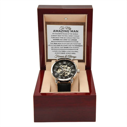 Are you looking for the perfect gift idea for your man? One that is unique and special? Celebrate your man with this stunning automatic skeleton watch with a heartfelt message. It makes for a wonderful Christmas, birthday, anniversary, or retirement gift.