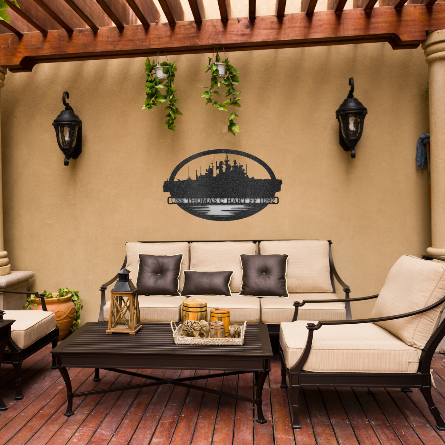 A custom metal US naval battleship, you can choose the ship, the text, the color, and the size of the metal wall art.