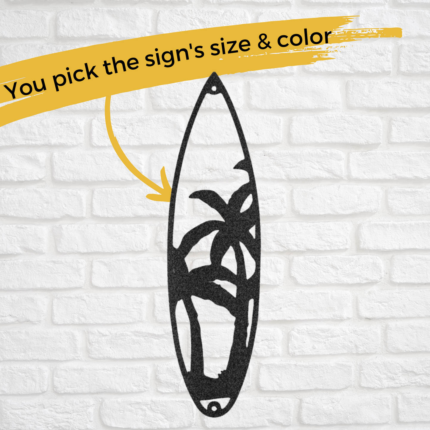 Are you looking for the perfect piece to fill that empty spot on your wall next to the pool or on the way down to the lake or beach? This could be the perfect custom metal palm tree surfboard or SUP board sign for you!