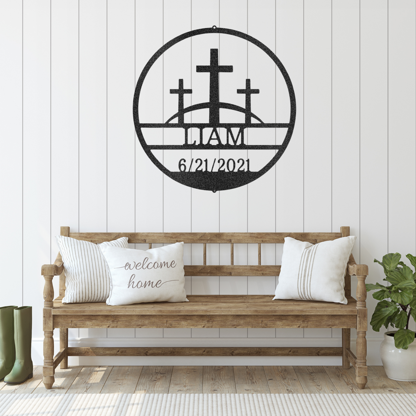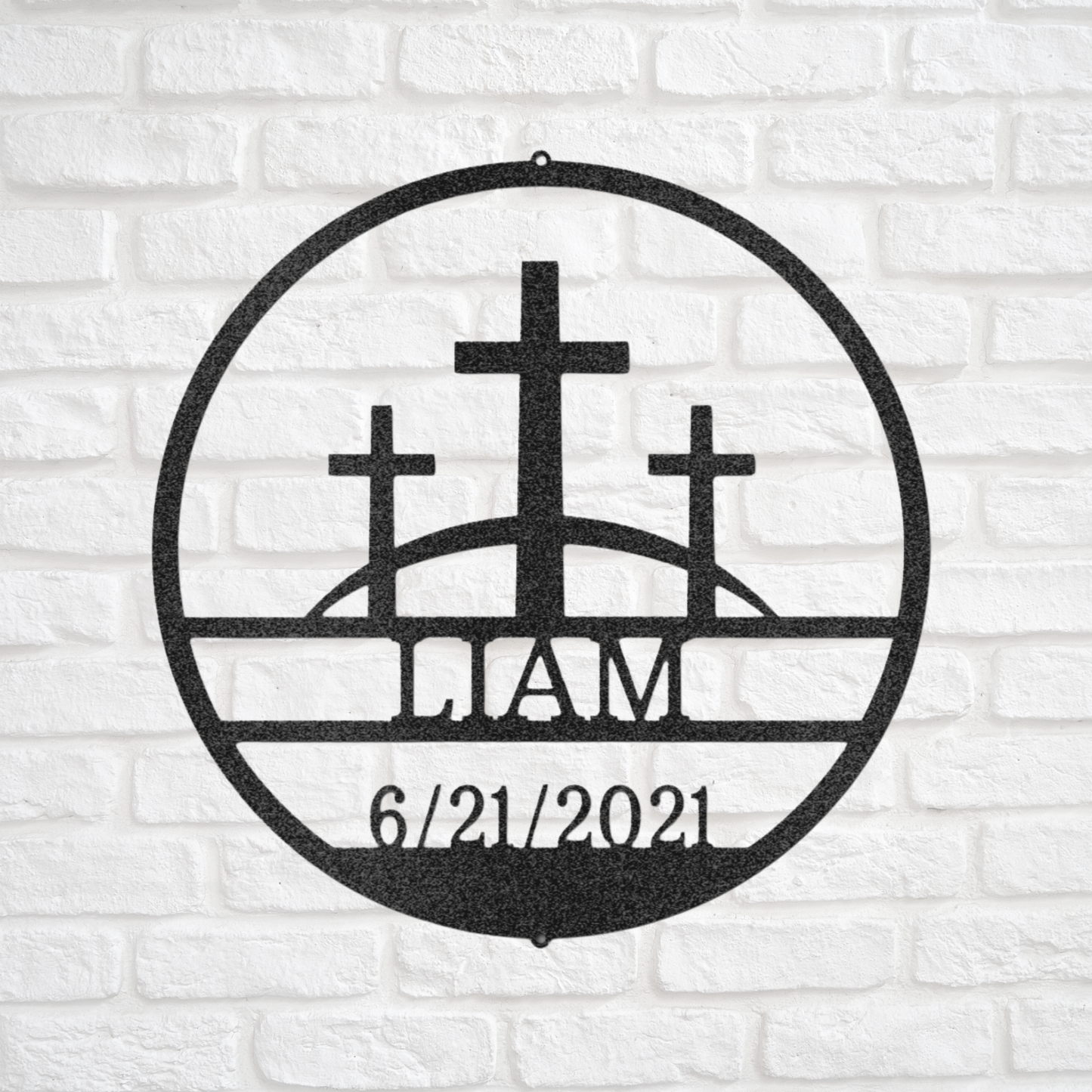 This custom metal sign makes for a wonderful way to remember or celebrate the baptism or confirmation of a loved one. This also makes for a nice Christmas gift or Easter present. The sign features 3 crosses on a hill and allows you to customize two lines of text.